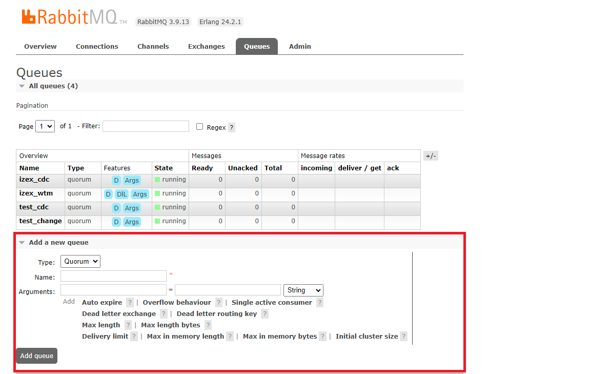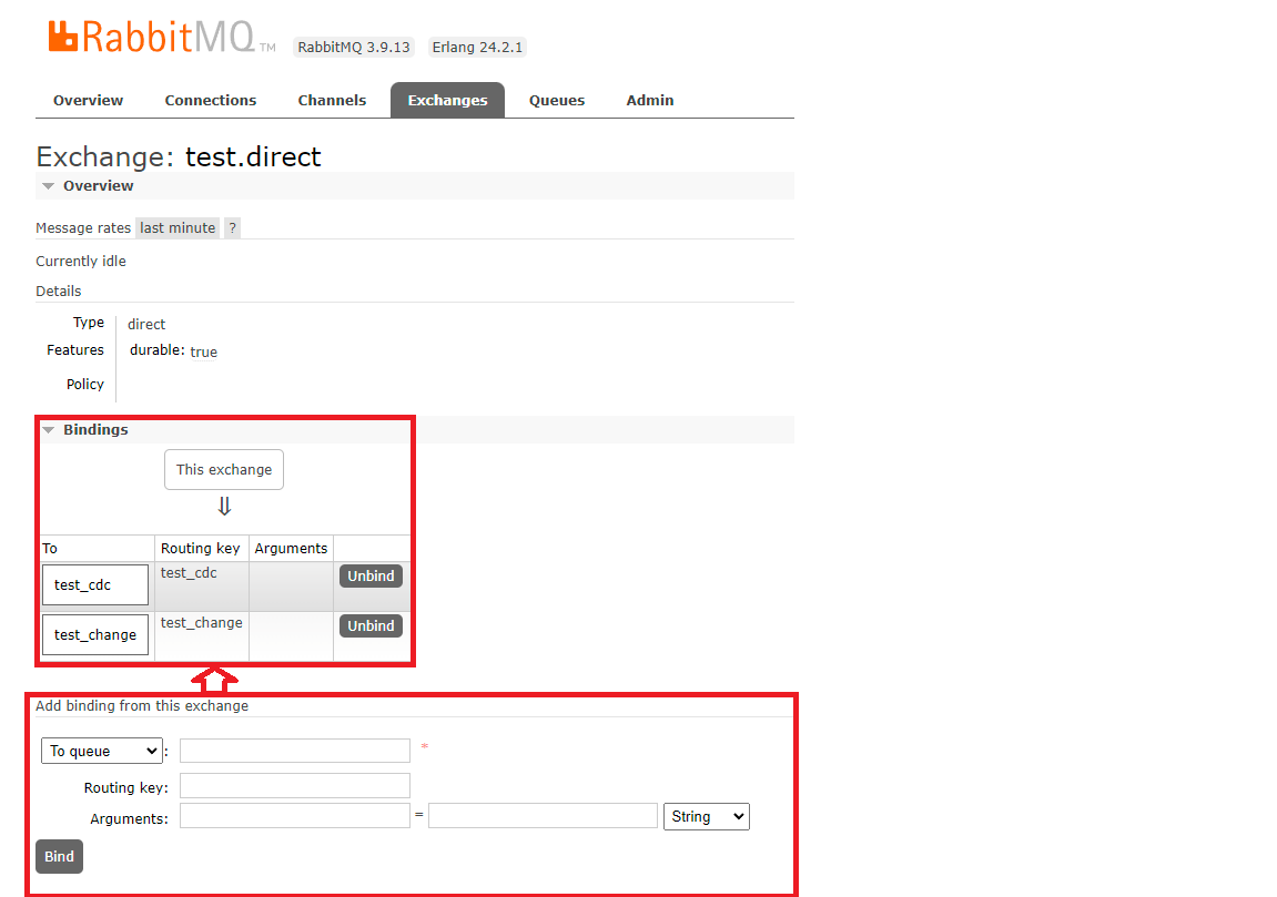- Exchanges에서 Queues에서 생성한 내용을 바인딩 해주면 구축은 끝이난다.