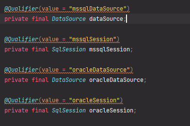 두개의 데이터 베이스의 정보를 설정하는 과정에서 문제가 발생했다. 동일한 타입을 가진 bean 객체가 두개 있다면 스프링에서 어떤 bean을 주입해야 할지 알 수 없어서 스프링 컨테이너를 초기화하는 과정에서 Exception이 발생을 하게 된다.