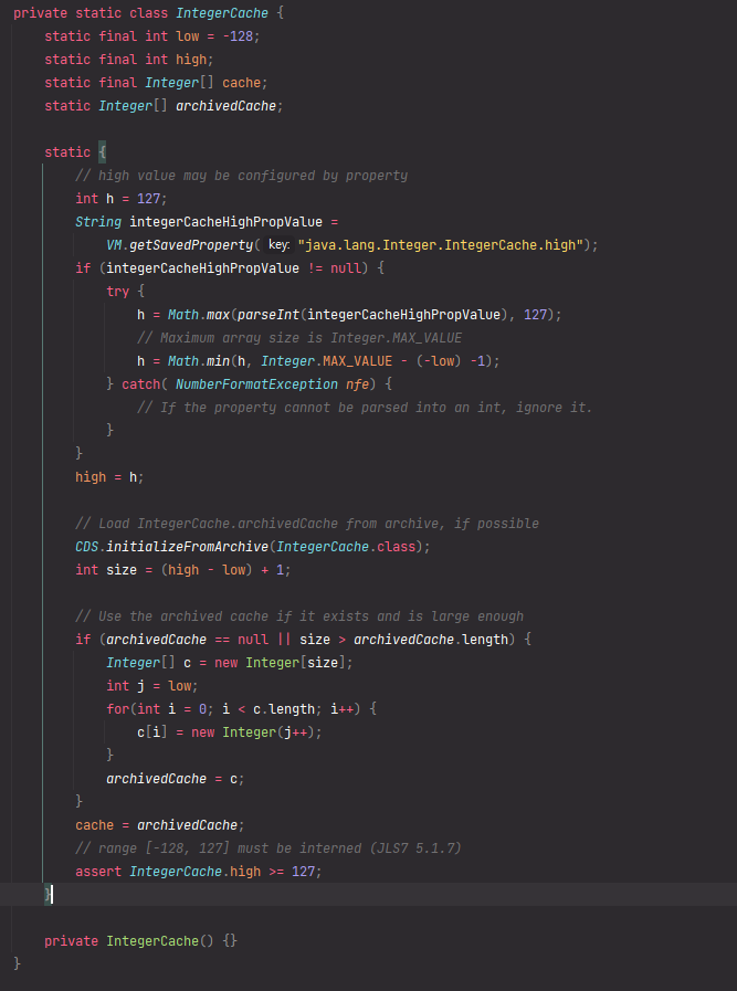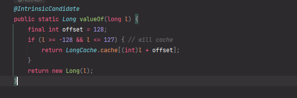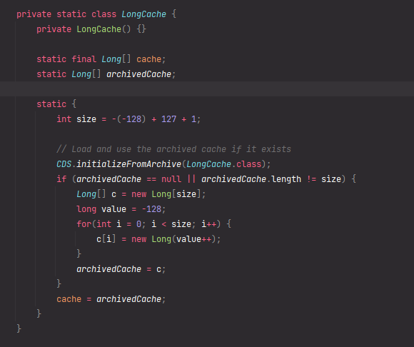 Long Class 내부에 있던 Inner Class이다. 내용을 보면 미리 기본값(-128 ~ 127) 사이의 인스턴스를 미리 생성하고 캐싱 처리를 하고 있는 모습을 볼 수 있다. 미리 생성된 인스턴스가 캐싱에 저장이 되면서 해당 범위 내에 있는 경우 캐싱되어있는 인스턴스를 반환하고 범위 밖인 경우는 새로운 인스턴스를 생성해서 반환을 하고 있던 것이다.