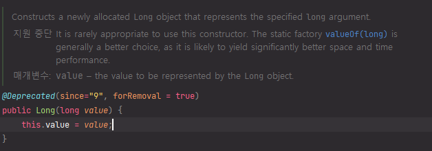 일부 Wrapper Class에 대해서도 확인해 보았지만, 모두 동일한 것으로 파악되며, 대신 valueOf()를 사용하도록 권장하고 있다.